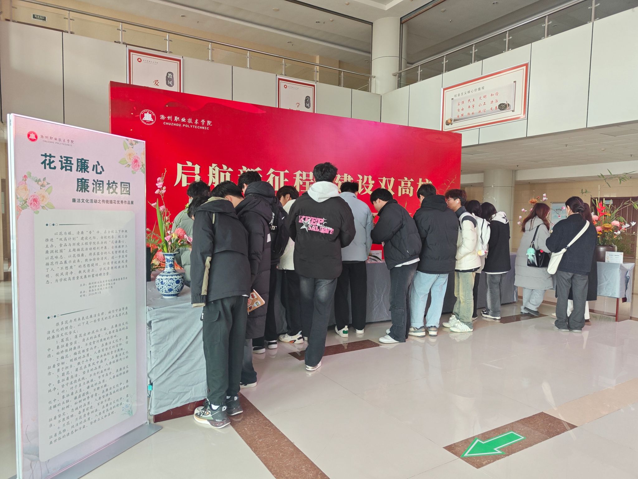 活动现场,安徽省“五一劳动奖章”获得者、安徽省插花花艺大师、非遗传统庐州插花项目代表性传承人赵宗祥详细讲授了传统插花的基本知识以及一些常见花卉所代表的廉洁文化含义。在花艺师细心指导下,参与者们经过自己的构思,将梅花、菊花、竹子和兰花等花卉错落有致的搭配在一起,形成一幅幅别有意蕴的作品,以花咏志、以花倡廉,从中感悟廉洁文化的魅力。插花活动结束后,赵宗祥老师选取了十幅优秀作品在学校综合楼大厅进行为期两天的展览,让更多的师生在花香四溢中沐清廉之风。