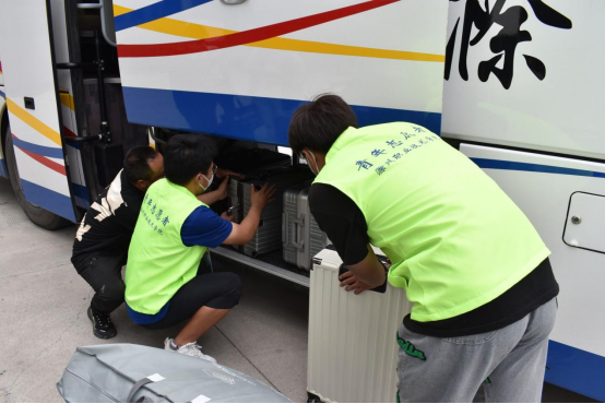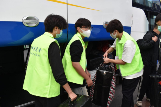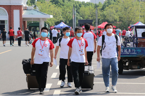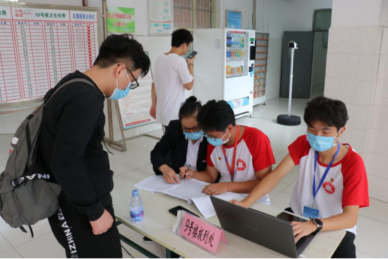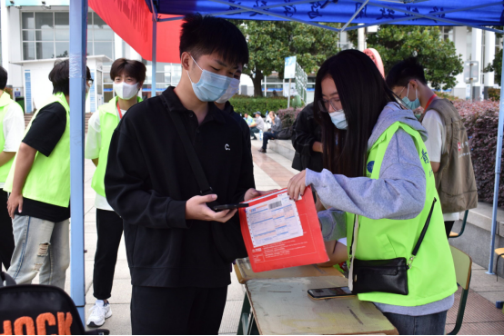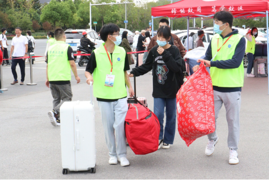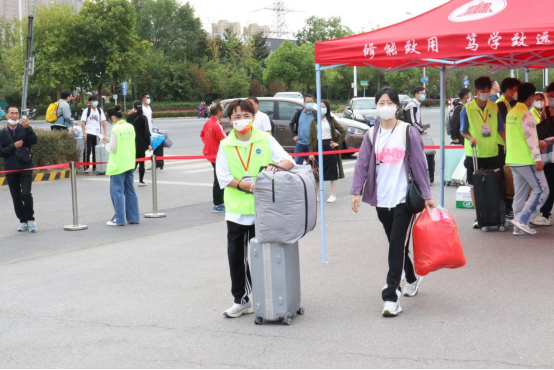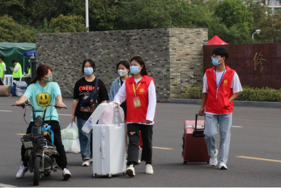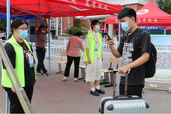 学校门口,师生志愿者同心聚力、各司其职,学生志愿者帮助报道新生搬运行李,教师志愿者强化校门口疫情防控工作,严格检查48小时内核酸检测阴性报告、健康码以及行程码。他们的每一次体温监测、行李消杀都为全校师生的疫情防控安全保驾护航。