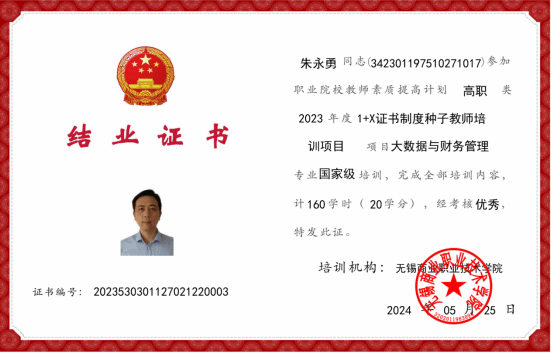 安徽省2023年度“高等职业院校教师素质提高计划”国家级培训项目于2024年春季举行。我院财务会计系朱永勇老师参加了其中“1+X证书制度种子教师培训项目“的大数据与财务管理专业国家级培训。