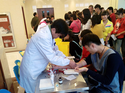 关注新生身体健康,使其德智体能全面发展。经济贸易系新生体检工作已经全面展开。2013年10月28日上午,经贸系团总支、学生会组织全体大一新生在学术报告厅内进行抽血采样工作。