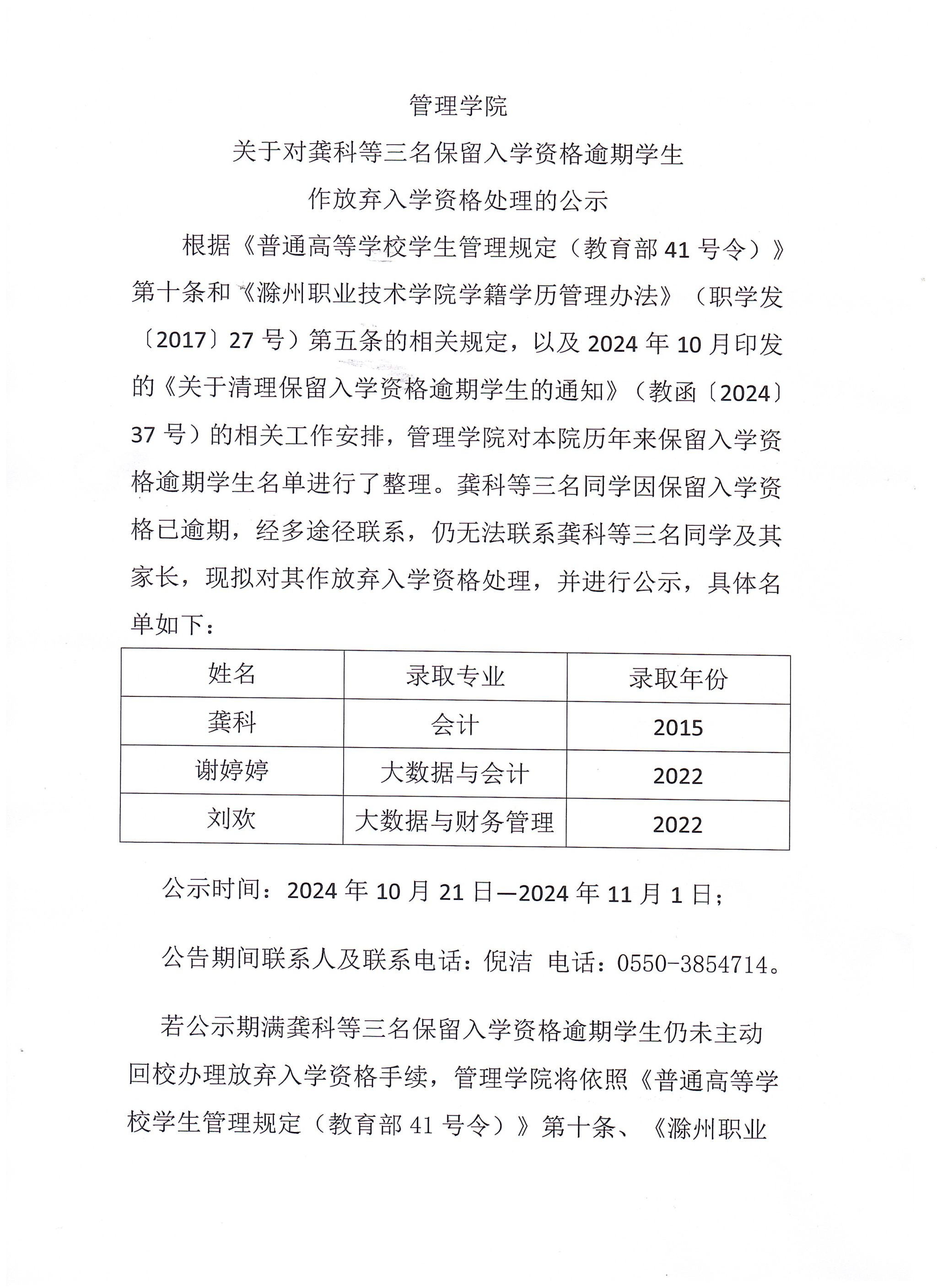 管理学院关于对龚科等三名保留入学资格逾期学生作放弃入学资格处理的公示
