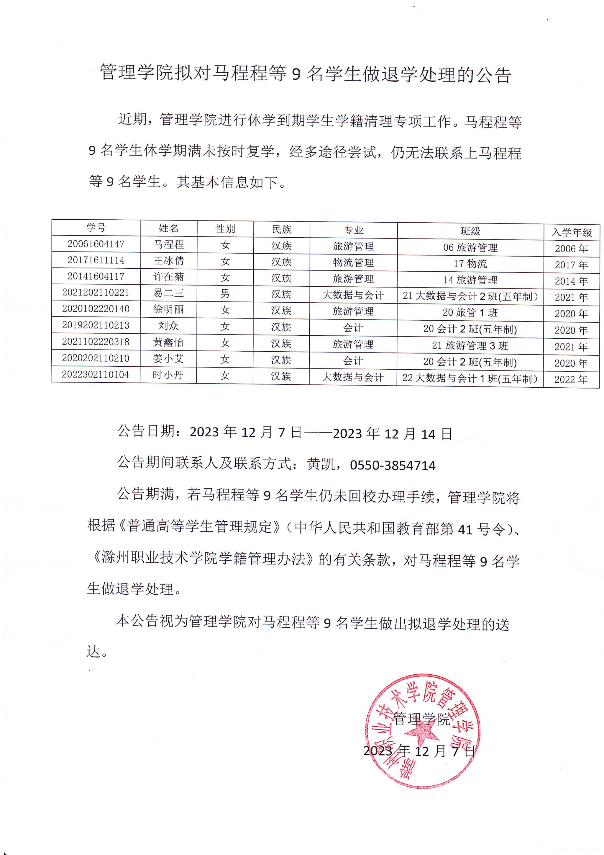 管理学院拟对马程程等9名学生做退学处理的公告