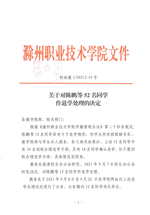 关于对陈鹏等52名同学作退学处理的决定 校政教(2021)54号