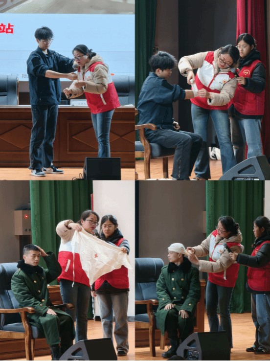 接着,谢晓韵为师生们带来了包扎和骨折固定方面的应急救护知识。她详细介绍了不同部位包扎的方法和技巧,以及骨折固定的基本原则和步骤。为了增强培训的实操性,谢老师还将事先准备好的包扎材料分发给了每位同学,让大家在座位上进行模拟练习。同时,她还邀请了几位同学上台,进行包扎和骨折固定的实操演示,并给予了专业的点评和指导。