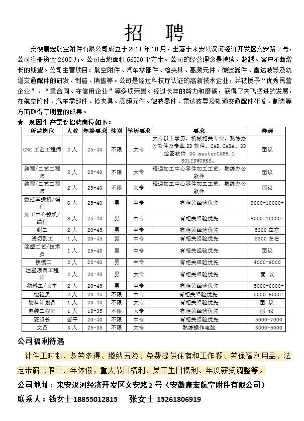 安徽康宏航空附件有限公司招聘