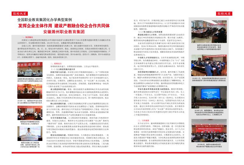 集团的建立由滁州市政府部门主导,市教育体育部门指导,beat365在线唯一官网牵头,政、行、企、校充分参与的协作、稳定、高效的运行机制,呈现出市教体部门与集团之间、行业企业与牵头单位之间、集团成员单位和二级机构之间你中有我、我中有你的工作格局,已初步建成经科教联动、产学研结合、校企所共赢的区域现代职业教育体系。现有成员130家,其中企业97家;设有15个二级机构,其中专业委员会9个。在理事会领导下,由秘书处协调、组织、落实各项具体工作。