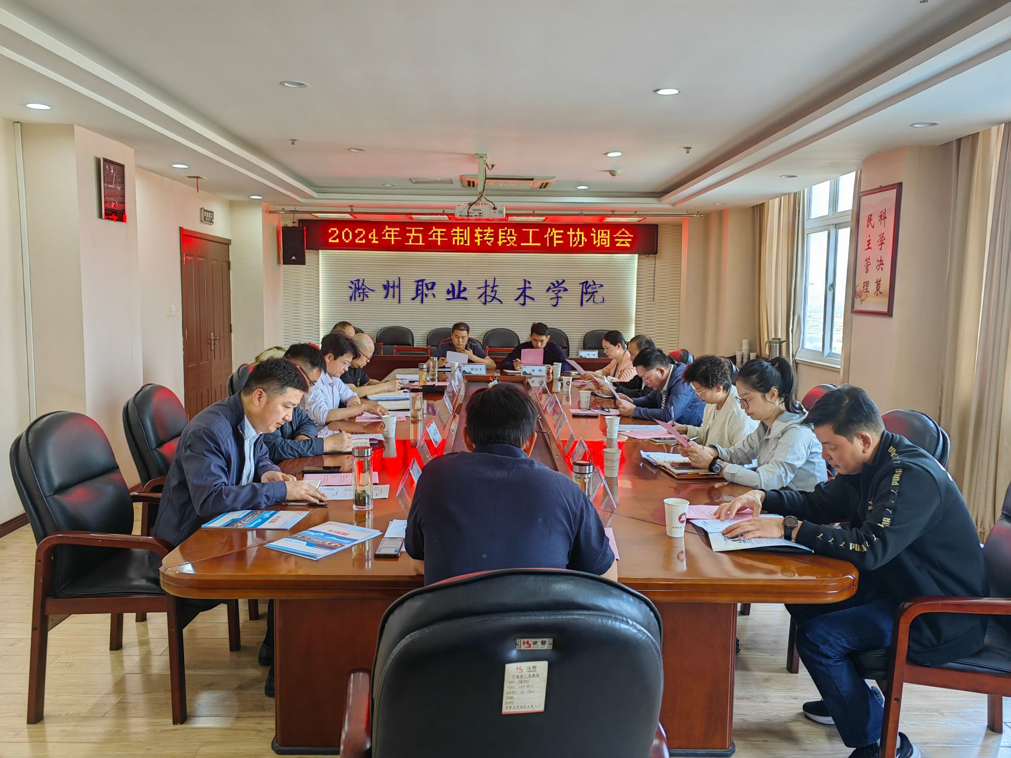为推进中高职一体化职业教育改革,进一步加强与中职学校的合作与交流,提升人才培养质量,保障beat3652024年五年制转段学生培养工作顺利开展,5月15日上午,学校在综合楼804会议室召开五年制转段工作协调会。beat365党委委员、副校长苏有良、胡凼,滁州市机电工程学校党委副书记、校长湛承鲲,党委委员张婷婷和双方教务处、学生工作处、招生就业处、后勤服务中心、团委及相关部门负责人出席会议。会议由招生就业处副处长王义利主持。