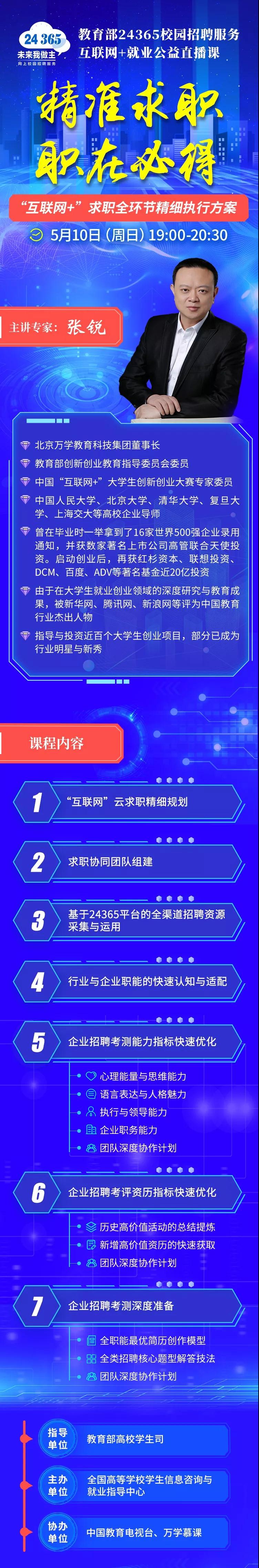 教育部第5场直播课:精准求职 职在必得——“互联网+”求职全环节精细执行方案,就在5月10日(本周日)晚19:00-20:30。