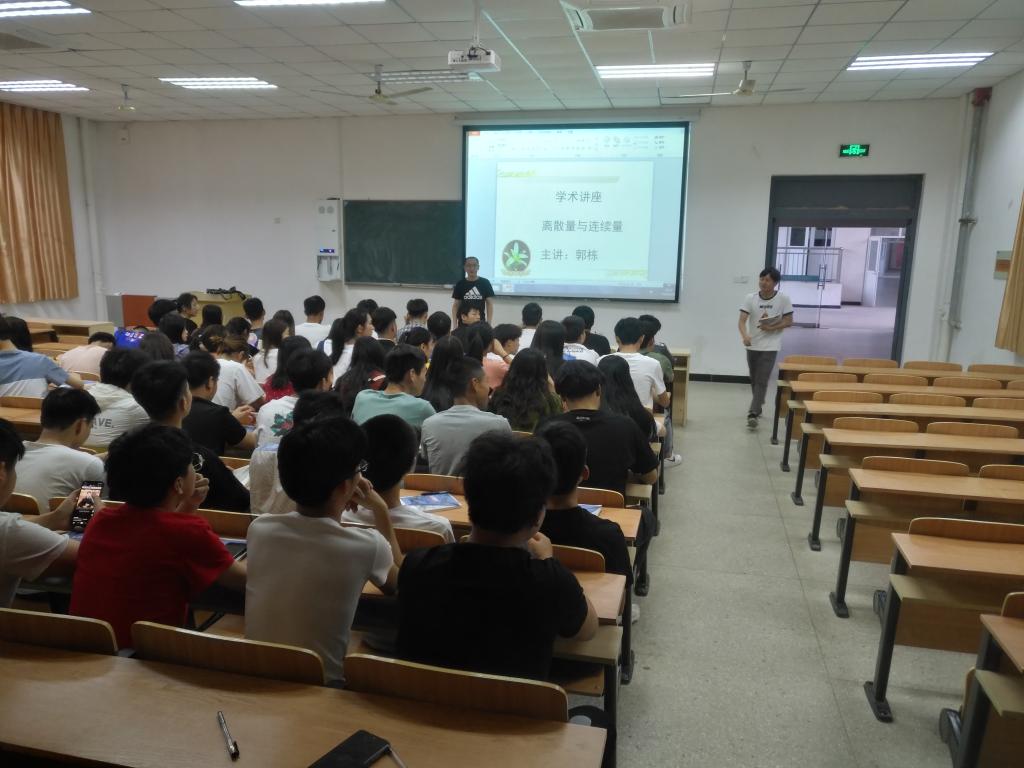2019年5月15日下午14:40,郭栋副教授在南阶103教室举办了“离散量与连续量”的学术讲座。全校对数学感兴趣的100多名同学聆听了此次讲座。