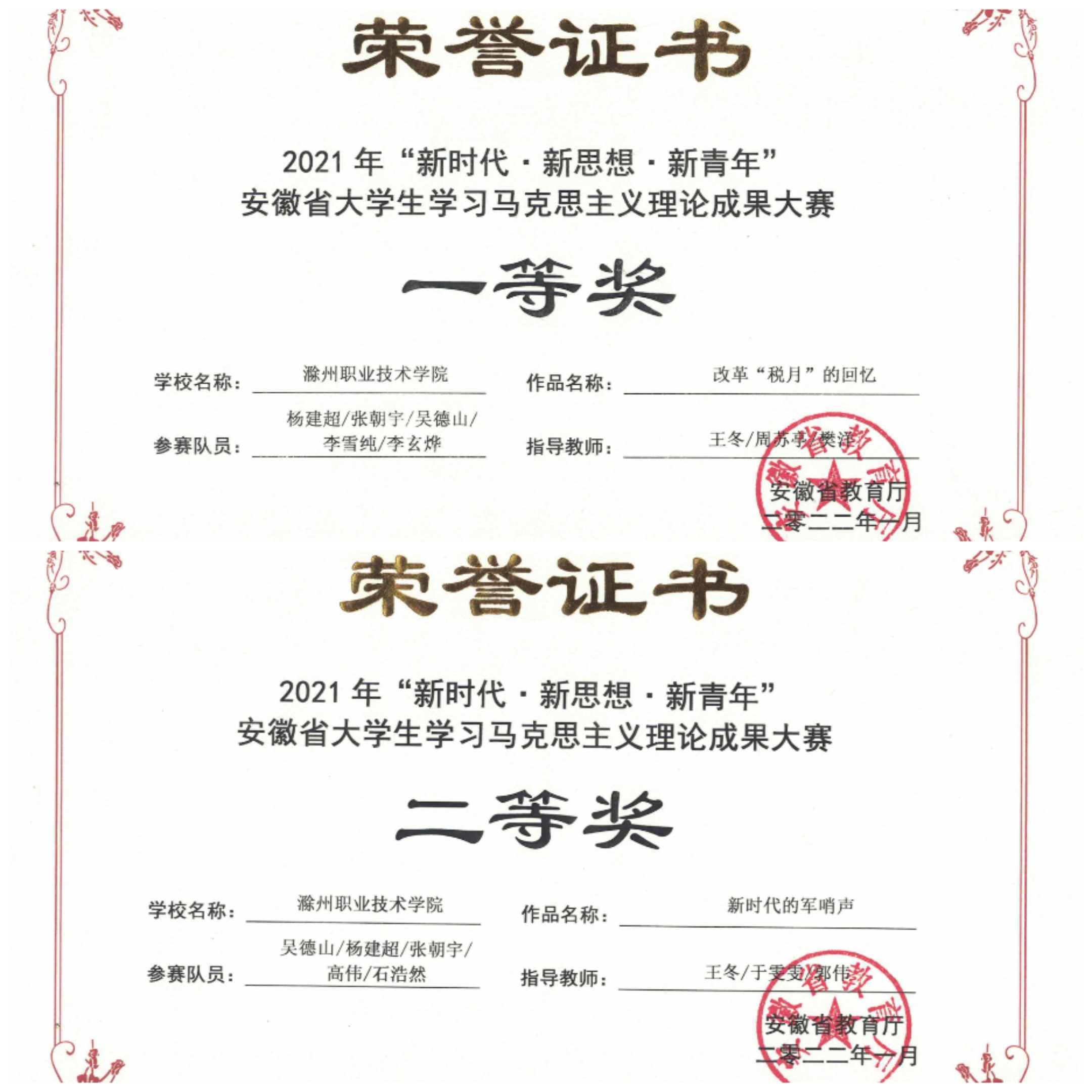 为深入贯彻落实习近平总书记在学校思想政治理论课教师座谈会上的重要讲话精神,积极构建与课堂教学相互促进的思政理论课第二课堂教学体系,马克思主义学院专职教师王冬、兼职教师樊洋师指导学生参加2021年“新时代·新思想·新青年”安徽省大学生学习马克思主义理论成果大赛创佳绩,在微视频赛项中,斩获一等奖第一名1项、二等奖1项,2人获优秀指导教师奖。
