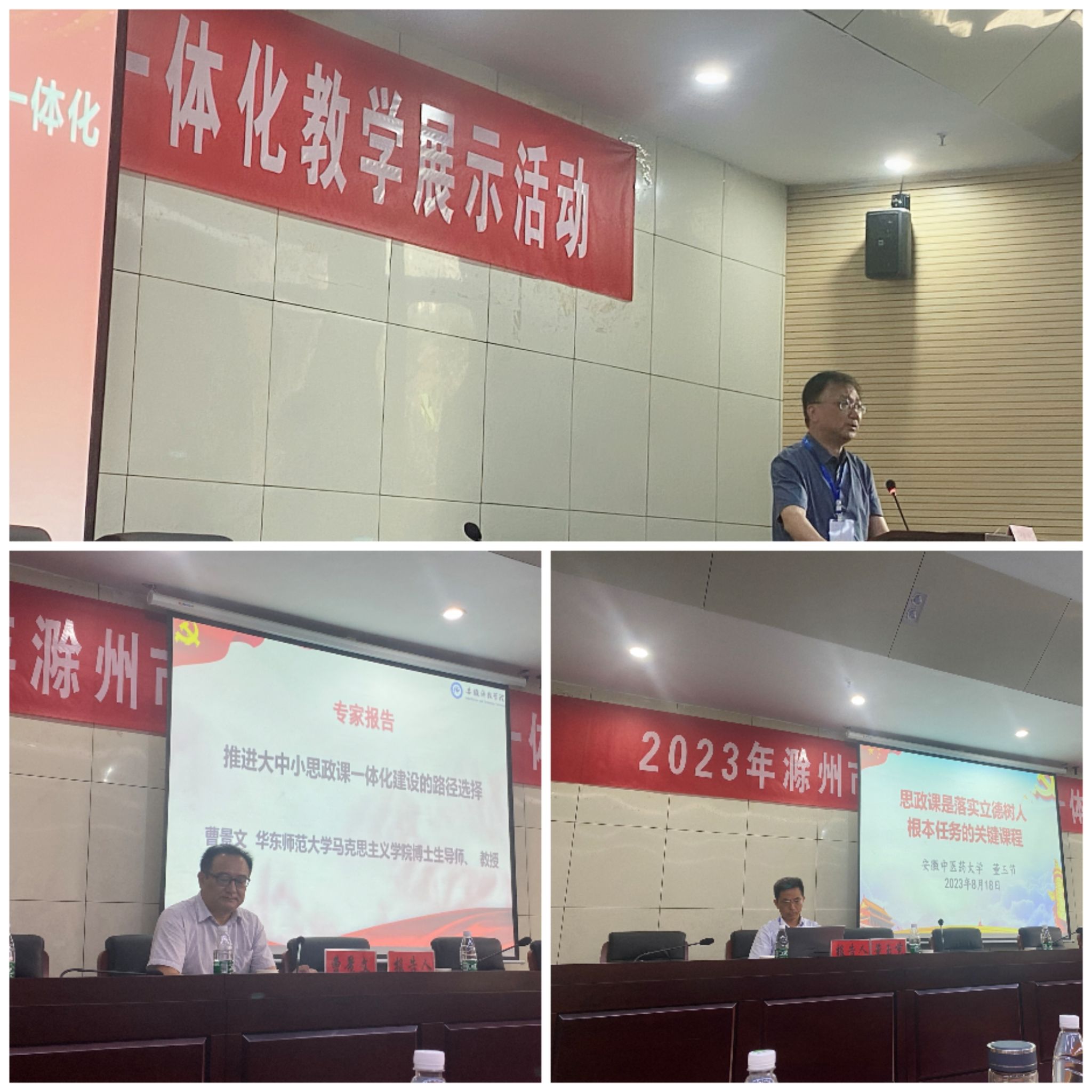 会上华东师范大学马克思主义学院博士生导师曹景文教授和安徽省高校思政课教指委办公室主任、安徽中医药大学马克思主义学院院长董玉节教授分别围绕《推进大中小思政课一体化建设的路径选择》、《思政课是落实立德树人根本任务的关键课程》为题作专题报告,报告阐述了大中小思政课一体化建设的内涵、任务和价值意蕴,明确了推进大中小思政课一体化建设的路径选择,同时指出了高校在推进过程中存在的不足和问题。