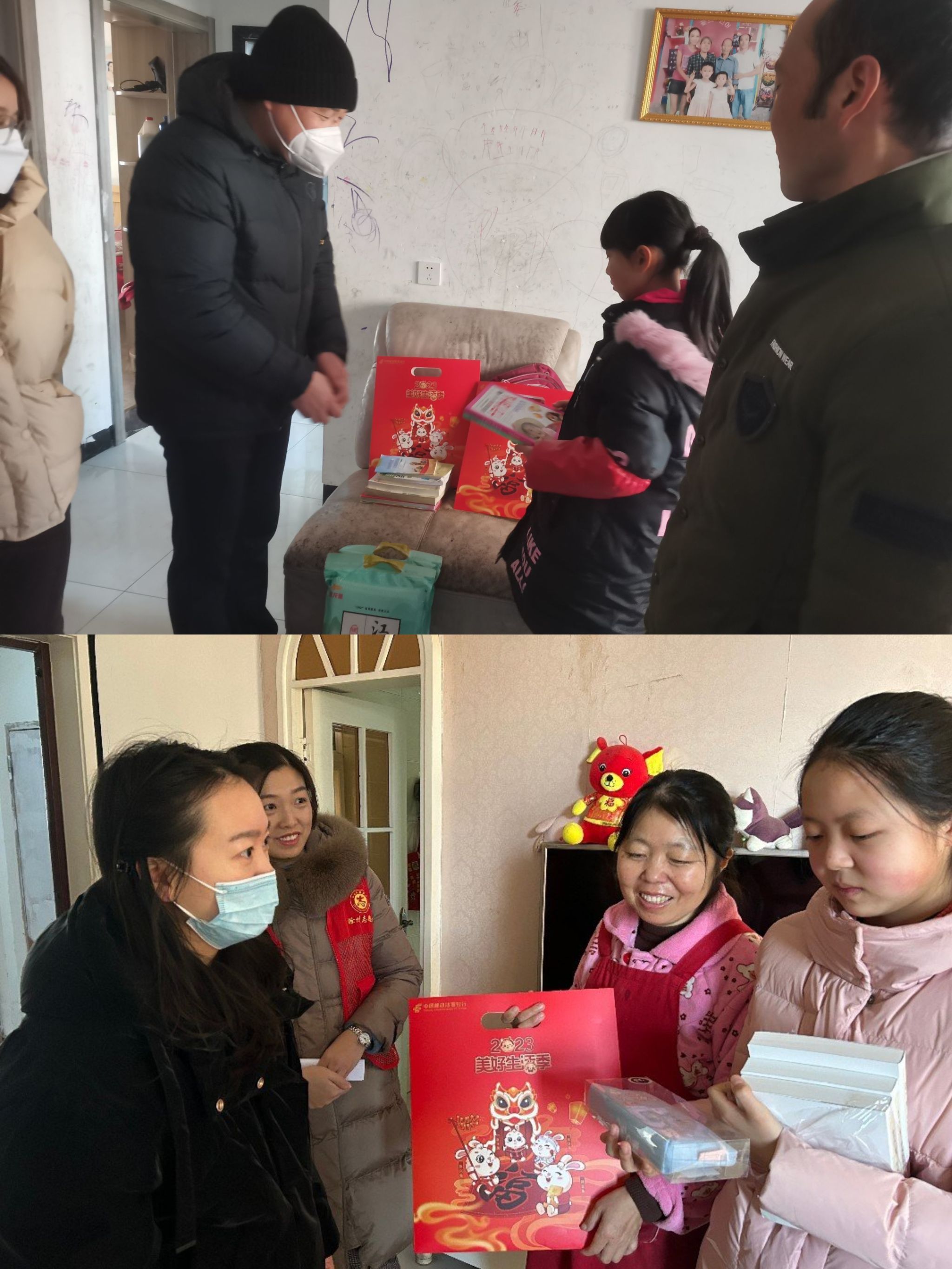 走访中,大家将事先准备好的礼物按照孩子们的心愿逐个送到他们的手中,还准备了大米、春联等慰问品,为他们送上新年祝福。询问孩子们目前的学习情况和生活中面临的实际困难,聆听孩子的新年愿望,鼓励他们要好好学习、自强不息,努力成为对社会有用的人才。