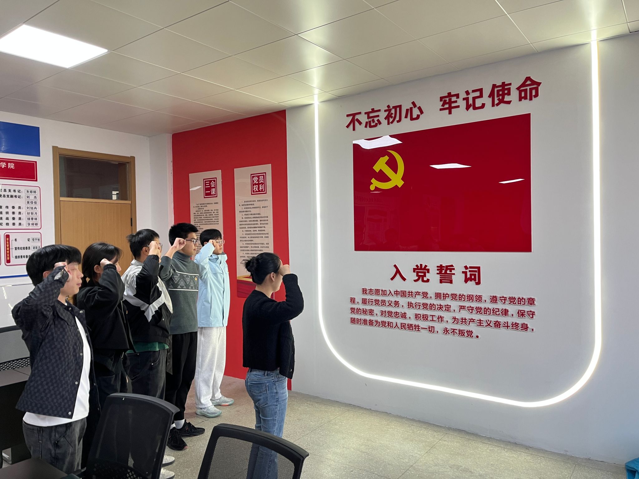 会议最后,由入党介绍人为新发展的预备党员佩戴党员徽章。支部书记倪子旭带领预备党员对党旗进行入党誓词。