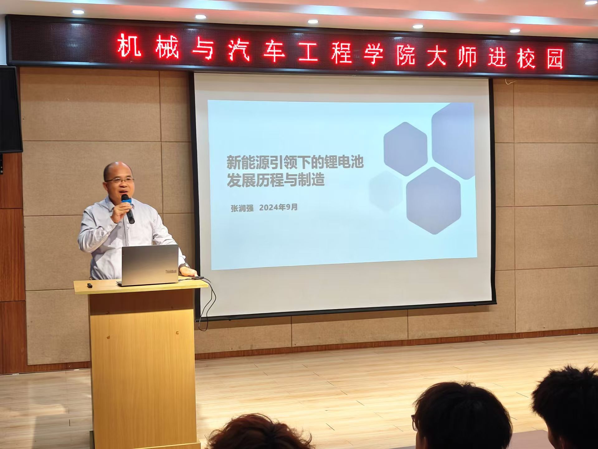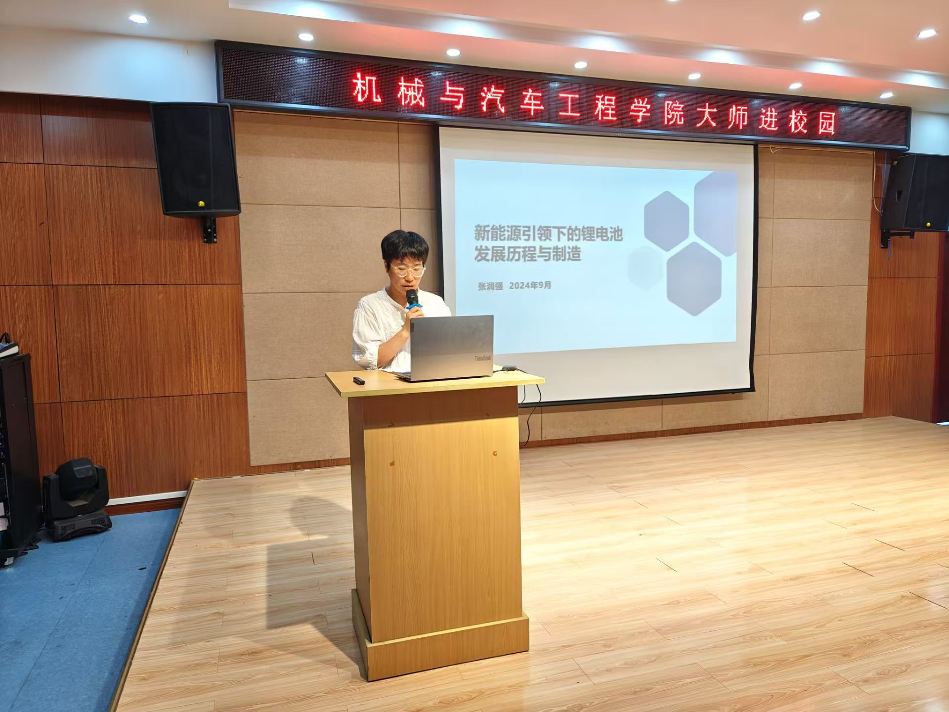 9 月 23 日,机械与汽车工程学院组织“大师进校园”学术讲座,邀请滁州力神新能源科技有限公司副总经理张润强来校,为2024级新能源汽车技术专业的学生开展主题为“新能源引领下的锂电池发展历程与制造”学术讲座。新能源汽车技术专业带头人杨诚、辅导员刘旭冉、全体2024级新能源汽车技术专业学生参加讲座,会议由学院党总支副书记吴佳佳主持。