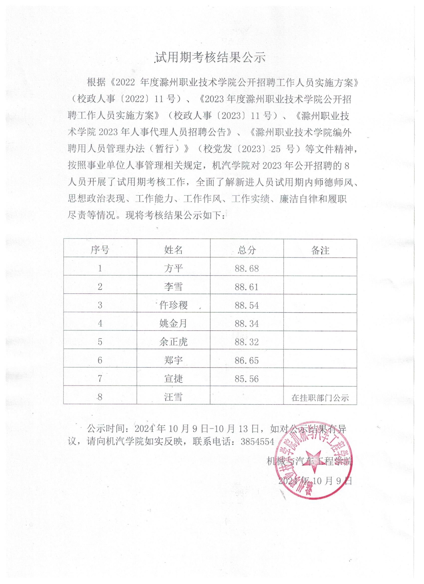 2023年入职人员试用期考核结果公示