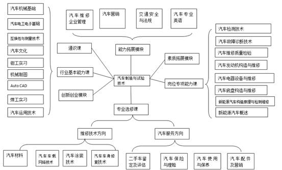 汽车制造与试验技术专业介绍 一、专业简介 汽车制造与试验技术专业即原汽车检测与维修技术专业,根据国家要求于2021年更名为汽车制造与试验技术专业。本专业与汽车生产制造及售后服务行业密切相关,需求人才多、待遇高。主要学习内容有汽车的生产制造与试验研究、汽车性能检测与维修保养、传统燃油汽车技术、新能源汽车技术等。 beat365汽车检测与维修技术专业开设于2004年,随着汽车专业的发展,于2012年6月成立汽车工程系,将本专业作为重点专业进行建设。2012年本专业获院级“特色专业”建设立项,同年获“省级专业综合改革试点专业”建设立项。2016年在省级质量工程建设中,汽车检测与维修技术专业立项为卓越人才教育培养计划项目;汽车检测与维修技术专业教学团队为省级优秀专业教学团队。其核心课程《汽车底盘构造与维修》专业课程教学团队为省级优秀课程教学团队。 二、培养目标 本专业培养理想信念坚定,德、智、体、美、劳全面发展,具有一定的科学文化水平,良好的人文素养、职业道德和创新意识,精益求精的工匠精神,较强的就业能力和可持续发展的能力;掌握本专业知识和技术技能,面向汽车制造业,汽车、摩托车等修理与维护行业的汽车整车制造人员、汽车摩托车维修技术服务人员等职业群,能够从事汽车质量与性能检测、汽车故障返修、汽车机电维修、服务顾问等工作的高素质技术技能人才。 三、就业目标 汽车制造与试验技术专业学生毕业后主要就业方向可分为:汽车服务企业、汽车制造企业及汽车其他相关单位。 汽车服务企业包括汽车4s店和汽车维修服务企业,主要可从事相应的技术岗位如:机电维修技师、钣金修复技师、车损理赔员、汽车维修质检员、汽车性能检测员、汽车配件管理员、售后服务顾问、汽车销售顾问等。 汽车制造企业可以从事汽车检验、试验、制造与调试等工作岗位 汽车其他相关单位可从事汽车保险理赔、汽车事故估损、二手车评估与销售、汽车性能检测等工作岗位。 beat365汽车制造与试验技术专业往届毕业生中不少学生已成为滁州车辆性能检测站、一汽大众、一汽奥迪、宝马、奔驰、上海大众、福特、比亚迪等知名品牌4s店的项目经理和维修技师。 四、主干课程 汽车制造与试验技术专业课程主要包括公共基础课程(通识课程)和专业课程。 1.公共基础课程(通识课程) 根据党和国家有关文件规定,将思想道德修养与法律基础、毛泽东思想和中国特色社会主义理论体系概论、形势与政策、大学语文、高等数学、实用英语、体育、计算机应用基础等列入通识课程必修课;并将大学生职业发展与就业指导、心理健康教育劳动教育、美育、职业素养等列入必修课和选修课。 2.专业课程 专业课程一般包括行业基本能力课程、岗位专项能力课程、专业方向拓展等课程、并涵盖有关实践性教学环节。主要包括以下教学内容: (1)行业基本能力课程 专业基础课程一般设置6~8门,包括:汽车文化、汽车机械基础、机械制图、汽车电工电子基础、钳工实习、焊工实习等。 (2)岗位专项能力课程 专业核心课程一般设置6~8门,包括:汽车发动机构造与维修、汽车电器设备与维修、汽车检测技术、汽车故障诊断技术、汽车底盘构造与维修、新能源汽车构造原理与检测维修等。 (3)专业拓展课程 专业拓展课程包括:汽车材料、汽车配件与营销、汽车使用与保养、汽车涂装技术、汽车车身修复技术等。专业拓展课程依据滁州地区产业结构的实际情况进行设置。具体课程体系构架图如下图所示。 其主干课程如下表所示。 汽车制造与试验技术专业主干课程一览表 五、实验实训条件 1.校内实训 为了提升汽车制造与试验技术专业学生的实践动手技能,学校成立了与专业学习相关的两个省级示范实训中心:机械实训中心,可用于本专业学生的钳工、焊工、车工实训教学;汽车实训中心,下设新能源汽车实训室、汽车发动机实训室、汽车底盘实训室、汽车电器实训室、汽车检测实训室、汽车钣喷实训室等实训室,可用于本专业的本专业学生的汽车机修、电工维修、钣金涂装等方面实训教学。 2.校外实训 另外学校与滁州周边多家品牌汽车4s店开展了校企合作,可送学生去进行教学见习、跟岗实习、顶岗实习、毕业实习。 校外主要实习基地基本情况 六、师资团队 本专业现有专业课教师19人,其中专任教师13名,校内兼课,校外兼职教师6人。正教授1人,副教授2人,讲师7人,其中拥有汽车维修技师资质6人,硕士研究生11人。师资队伍中,省级教学名师1人,省级教坛新秀1人,院级教坛新秀2人,院级教学名师1人,校级专业带头人1人,校级优秀骨干教师4人。 汽车制造与试验技术专业教学团队立项为省级专业优秀教学团队;《汽车底盘构造与维修》专业核心课程教学团队立项为省级课程优秀教学团队。 七、专业特色 汽车制造与试验技术专业人才培养特色主要表现在: 1.强化实践教学,专业核心课程理实一体化教学 针对核心课程建立了发动机拆装实训室,底盘拆装实训室,汽车电器实训室,汽车检测实训室,直接将核心课程教学和实训相结合,将课程教室搬到实训室,采取核心课程教学模式采取理实一体的教学模式,强化实践教学。 2.注重技能培养,课堂教学与技能鉴定相结合 依托学院成教部的技能鉴定站和汽车系机械行业委员