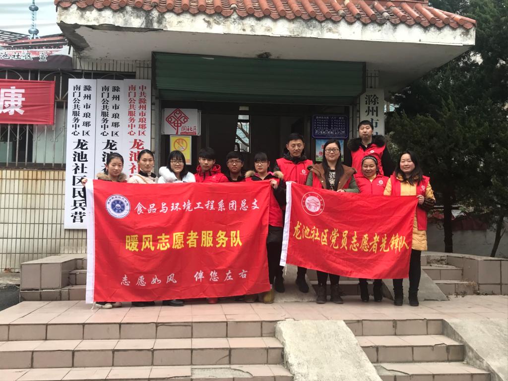 为进一步与龙池社区合作,加强与社区的联系,食环系与龙池社区协商,建立志愿服务基地。2017年12月28日,食品与环境工程系大学生志愿服务基地挂牌仪式在龙池社区顺利举行。食环系学生党支部书记张功会、宣传委员付金凤、组织委员戴缘缘、社区负责人孙涛、志愿者分会暖风服务队志愿者代表参加了本次仪式。