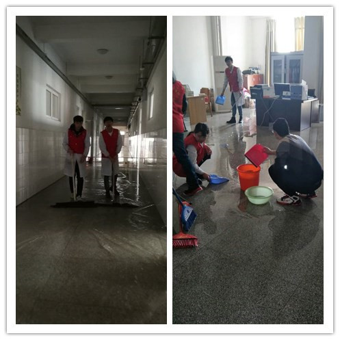 由于积水较深、范围较广,清扫工作较为困难,志愿者们不怕难不怕累,利用简单的排水工具一点一点一遍一遍的打扫,他们的鞋子和裤脚都湿透了,却依然坚持。经过一上午的努力,积水已被清理干净。
