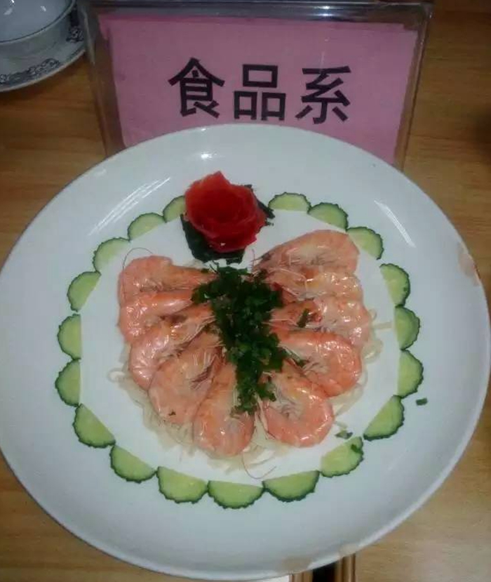 此次厨艺比赛融知识性、操作性于一体,答题取材厨艺比拼两个环节,来自全院的七支代表队根据抽签顺序答题取材,进而烹制各自的拿手菜肴。食品系在抽签排位最末的不利形势下,队员们冷静对答、沉着应战,最终凭借作品“无限‘虾’想”获得评委们的青睐,荣获第一名