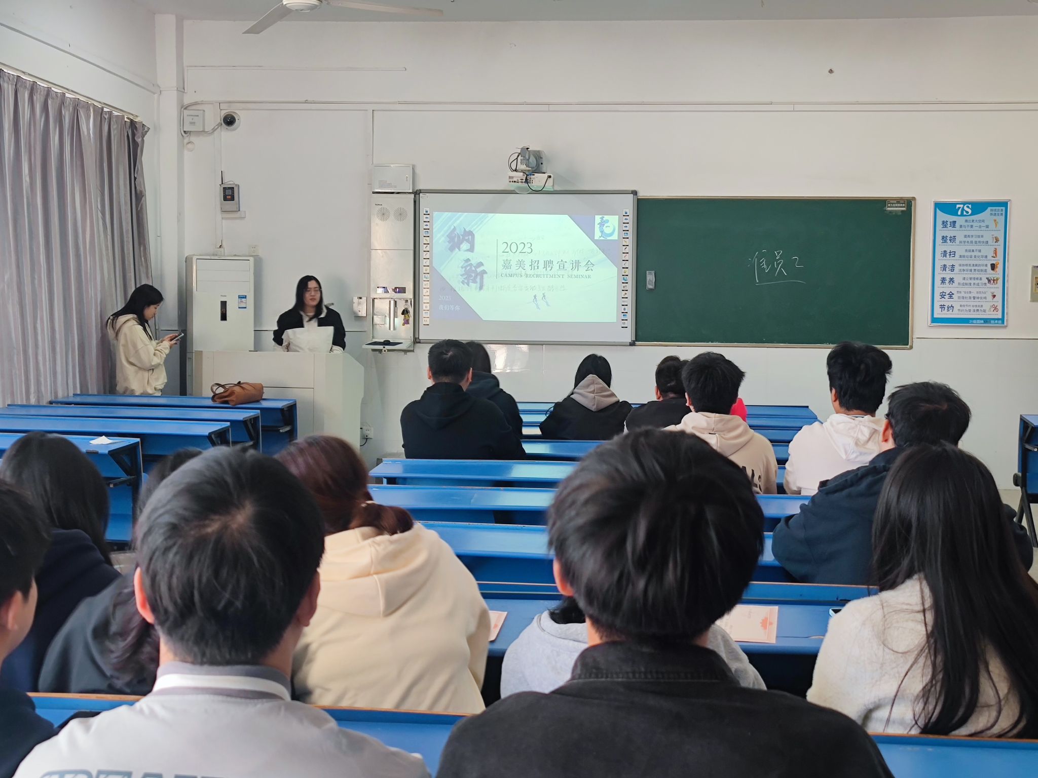 随后,嘉美集团人力资源专员武运勤开展了2023年校园招聘宣讲,通过视频短片、PPT等介绍嘉美集团的发展历程、企业文化及实力,重点介绍了招聘岗位、食宿环境、薪资待遇、发展空间及往届毕业生到该企业就业情况。现场解答了同学们关于实习就业方面的问题。
