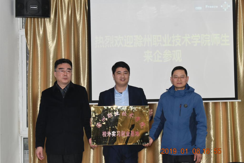 为进一步掌握2019届毕业生实习情况,加强校企合作,2019年1月8日,食环系党总支书记陈震、副主任梁建军及教学秘书孟飞一行3人赴垦荒人(安徽)科技有限公司滁州分公司看望食品专业7名实习生并举行校外实习就业基地挂牌仪式。