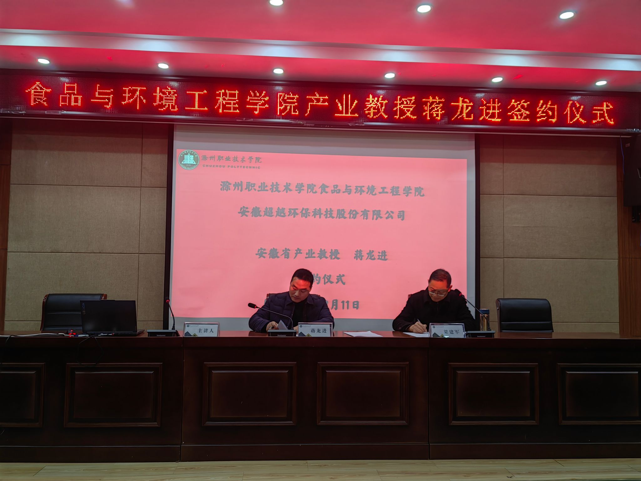 为拓宽教师队伍来源,优化师资结构,推动建立校企联合培养人才模式,2023年12月11日上午,食品与环境工程学院举行产业教授聘用签约仪式。安徽超越环保科技股份有限公司董事、副总经理蒋龙进,食品与环境工程学院院长梁建军、副院长孟飞及应用化工系全体教师参加了仪式。仪式由梁建军主持。