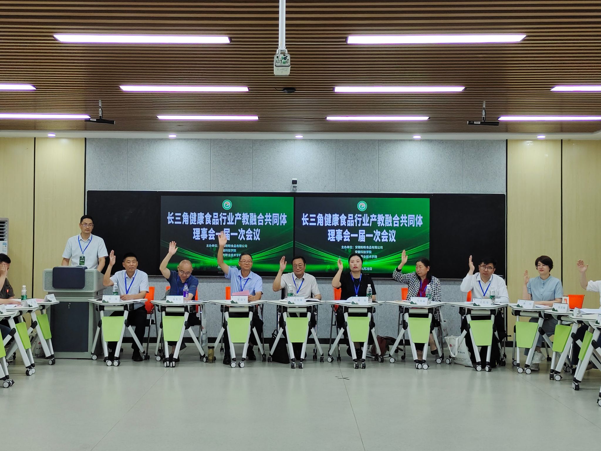 大会审议表决通过了《长三角健康食品行业产教融合共同体章程(审议稿)》《长三角健康食品行业产教融合共同体首批成员单位建议名单(共60家)》《长三角健康食品行业产教融合共同体首届理事会和秘书处负责人建议人选》。安徽盼盼食品有限公司、安徽科技学院、beat365在线唯一官网当选为长三角健康食品行业产教融合共同体理事长单位,30多个单位为副理事长单位。安徽盼盼食品有限公司总经理步显勇、安徽科技学院食品工程学院院长杜传来、beat365在线唯一官网党委副书记、校长许雪峰当选为首届理事会理事长,安徽盼盼食品有限公司生产厂长王磊、安徽科技学院食品工程学院副院长郑海波、beat365在线唯一官网党委委员、副校长苏有良当选为首届理事会常务副理事长,安徽盼盼食品有限公司质量经理谢艳、beat365在线唯一官网食品与环境工程学院院长梁建军当选为首届秘书长,安徽盼盼食品有限公司人力资源部经理张芳、beat365在线唯一官网食品与环境工程学院副院长孟飞当选为首届理事会副秘书长。