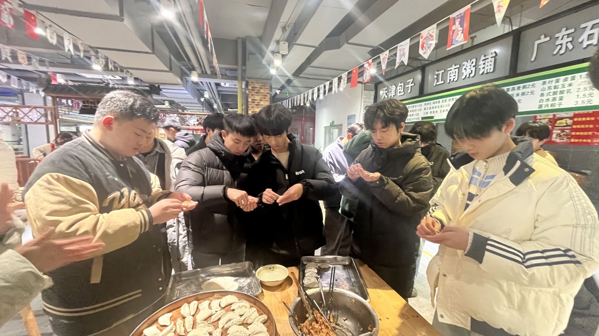 老师和同学们认真做好准备工作,互相传授包饺子的经验,边包饺子边聊天,热情高涨,各展所长,个个动作娴熟。同学们一手拿起饺子皮,一手填馅,双手合拢一捏,一个个形态各异的饺子就成型了,一双双灵巧的手把浓浓的冬至情通通包进了圆鼓鼓的饺子里。在包饺子的间隙中,水也烧开了,一个个大小不一却显得憨态可掬的饺子排排队进入了滚烫的水中,不一会便翻着白肚皮浮在水上。随后,一盘盘冒着热气的饺子便端上了桌,在零下10度的冬至日,在饺子的热气氤氲下,天气似乎都没那么冷了。