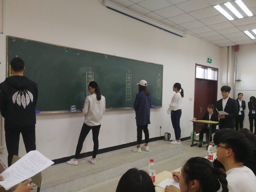 半决赛首先开赛,各系参赛者按照抽签顺序依次对战。选手确认没有疑问并明确准备完毕后,主考官宣读汉字并宣布开始答题,选手在黑板田字格上进行作答,限时60秒。台下观众也讨论激烈,赛场氛围十分活跃。在经过两场半决赛,十轮精彩较量以后,食品与环境工程系系、经济贸易系、汽车工程系、机电工程系晋级决赛。