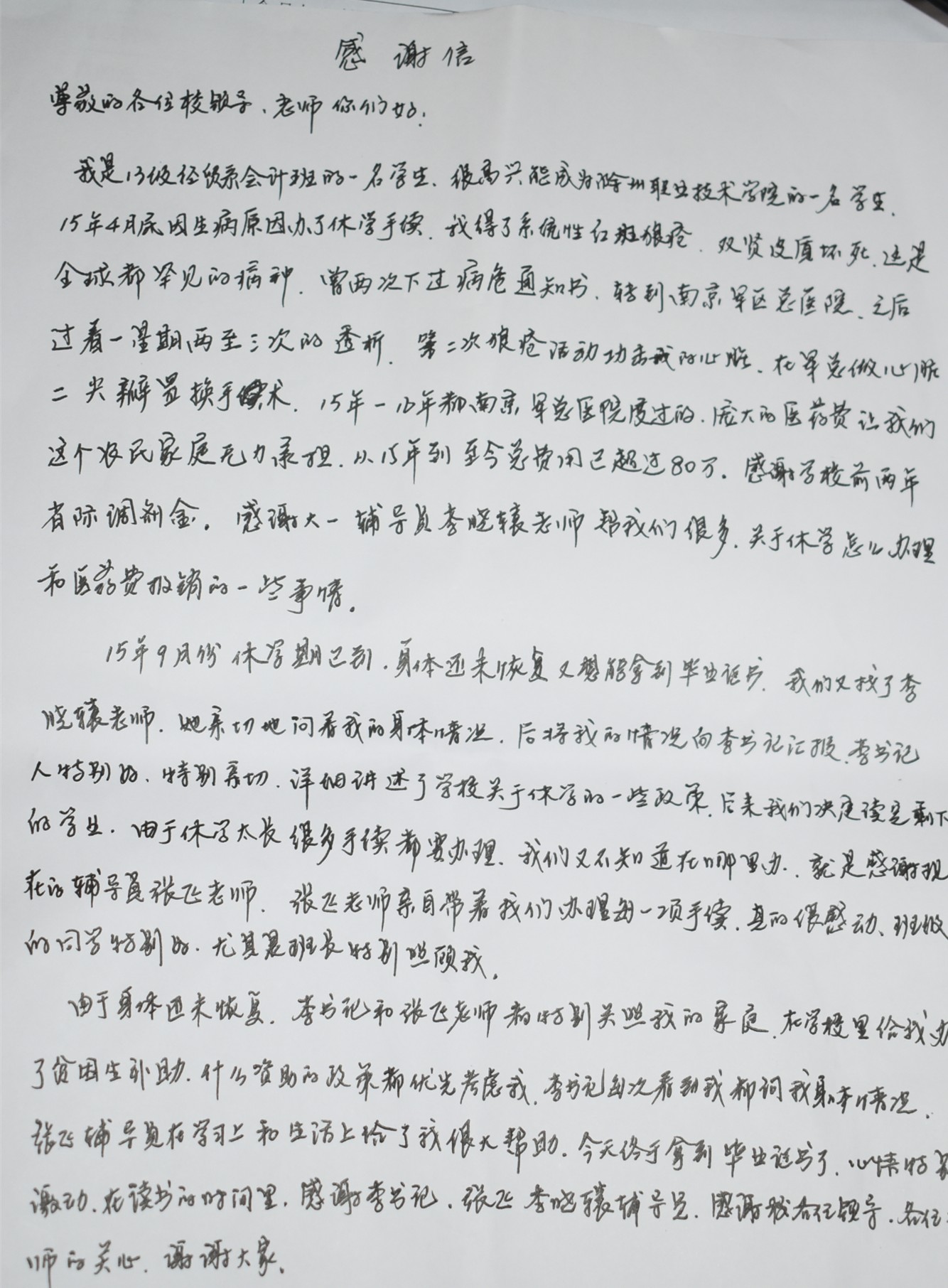 江洁一行先后深入天长市永丰镇和新街镇,看望我院经贸系和土木系两名困难学生家庭。不管是病魔的无情折磨,还是亲人相继离去的悲恸,两名学生始终乐观坚毅。得知我们要来,饱受病痛折磨、浑身没有一丝力气的小王让父亲代写了一封长长的感谢,细数在校受到的关怀与帮助,字里行间流露出对学校的爱与感恩。她们灿烂的笑容与感恩的情怀深深触动了走访人员的心。