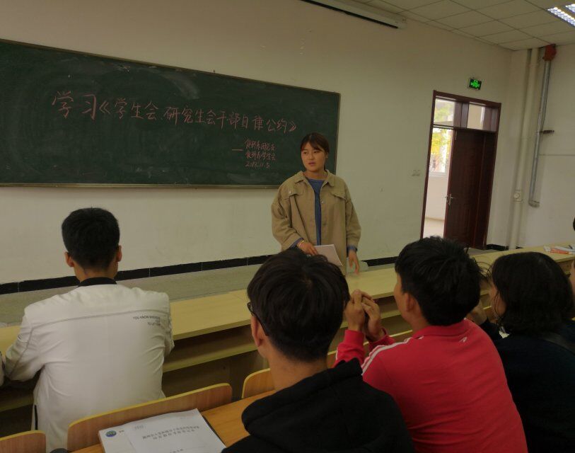 为了肃清学生干部的“官僚气”,恢复校园的风清气正,系团总支副书记唐文静与学生会主席薛琳琳于11月5号召集食环系团总支、学生会全体干事在南阶101室举行了《学生会、研究生干部自律公约》学习讨论会。