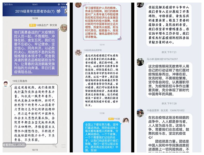 两位援鄂医疗队成员通过云采访直播,讲述了他们战斗在抗“疫”一线的生动故事和心路历程。李苗苗和王吉文是滁州市第一批援鄂医疗队队员之一,他们动情地讲述了在武汉重症监护室工作的经历。虽平凡却伟大的点滴时刻,获得了广大团员青年的广泛关注,也引发了食环学子的激烈讨论。在他们身上,我们看到了青年人的勇敢和奉献精神,更明白作为青年一代应该勇担大任,为国争光。这是青年人义不容辞的责任,也是我们实现人生意义、丰富人生价值的良好机会。