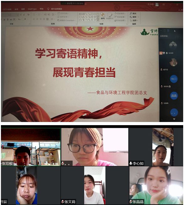 为深入学习宣传贯彻习近平总书记五四寄语精神,坚定青年学子理想信念,争做新青年。6月3日中午,食环学院团总支开展“学习寄语精神展现青春担当”为主题的线上团日活动。由于疫情影响,活动采取线上视频方式进行。