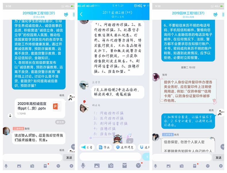 18、19级各班通过召开主题班会的形式,带领班级同学学习国家和学院的资助政策,共同学习“2020年高校诚信宣传ppt”和“人行个人征信知识介绍”宣传材料,并对评定办法进行解读。解读中号召大家进行诚信贷款,诚信还款,普及征信知识、金融知识,提升个人信用水平。并就“诚信教育,预防诈骗教育、远离不良贷、套路贷警示教育”展开线上讨论。临近期末,辅导员还重点强调了诚信考试,提醒同学们考试作弊的后果和危害,要求同学们严格要求自己,端正考风、严肃考纪,以饱满的姿态迎接期末考试。