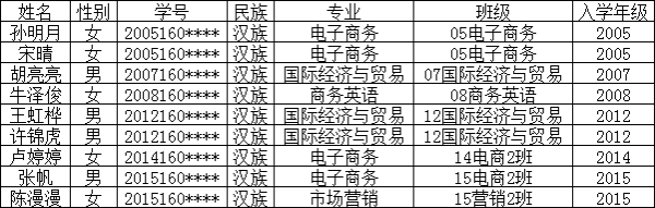 近期,商学院进行休学到期学生学籍清理专项工作。孙明月等9名学生休学期满未按时复学,经多途径尝试,仍无法联系上孙明月等9名学生。其基本信息如下