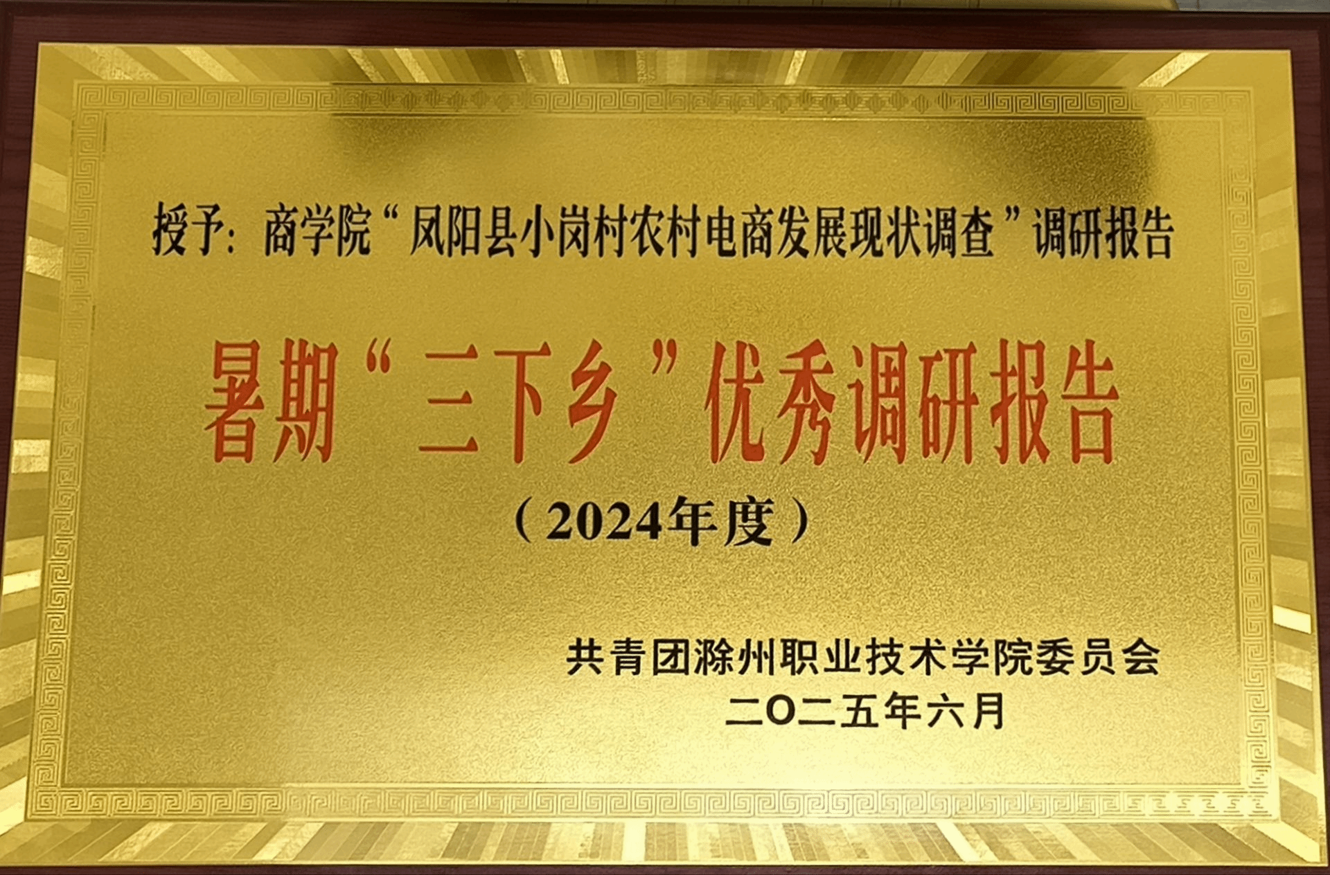 商学院获得2024年度暑期“三下乡”优秀组织奖、融创践行——电商助农小分队获评暑期“三下乡”优秀团队、《凤阳县小岗村农村电商发展现状调查》调研报告被评为“优秀调研报告”。这些荣誉充分体现了商学院师生将专业知识转化为服务乡村振兴的实际行动力,展现了良好的组织协调能力和扎实的调研水平。