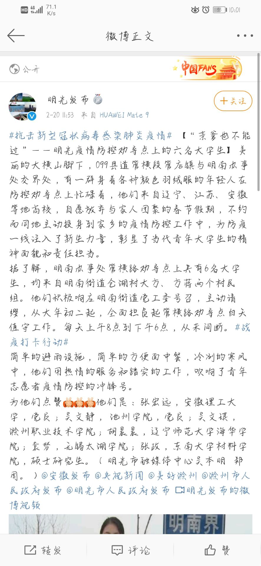 吴文琪,2019级电子商务1班的学生,同时也是一名防疫志愿者。从大年初二起至三月份,每天早上8点到下午18点,全面担负起明光市099县道横段管店镇与明南办事处交界处管横路劝导点白天值守工作。“我是一名普通的学生,虽然不能像医务工作者一样‘逆行’疫区,但我有一颗热忱的心,要为这场没有硝烟的‘战疫’贡献微薄力量。”这是商学院19级电子商务1班吴文琪说,来自滁州明光的她积极参加村委会组织的防疫志愿工作,按照村委安排主要负责对村民进出排查统计和宣传防疫知识,并对出入村口的村民测量体温,做好登记。吴文琪同学积极参加疫情防控志愿服务工作,向村民们宣传注意防疫事项,在村口卡点登录外来人员,督促其佩戴口罩等工作。
