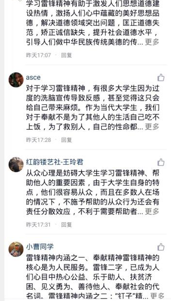 活动一开始,由学生会纪检部成员从网上和各软件中挑选一些关于雷锋精神的相关知识与问题并总结在一起。随后在班长群里发布关于“雷锋月座谈会”的相关活动要求,并要求每个班长发布到各自的班级群里,让自己班的同学加官方QQ,并在讨论题下发表自己的见解。文件发布后,同学们在空间里热情的回复,激烈的讨论,增强了同学们在参加各项活动的能动性,每个人的评论都真知见灼,点出了自己的见解,为雷锋精神在校园传播打下了基础。