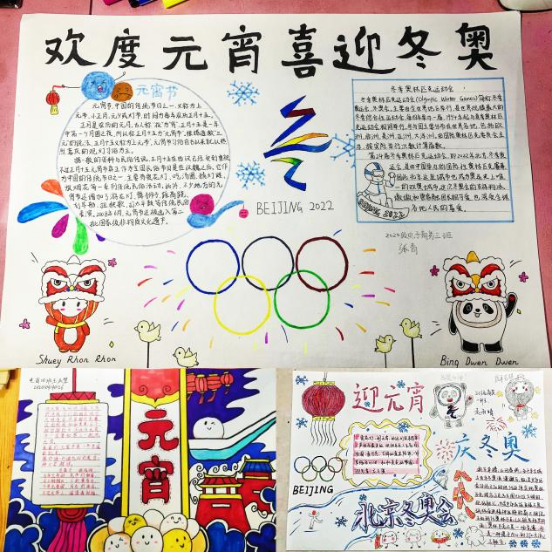 正值假期,同学们身处不同区域,通过主题手抄报,花灯制作和祝福视频三种形式参与本次活动,最终共收到48份作品。其中,王永慧的手抄报色彩丰富,赵雨晴和张青的手抄报都融合了顶流“冰墩墩”和“雪容融”的元素,将元宵佳节和冬奥会结合的恰到好处。同时花灯制作样式繁多,李坚雨的红灯笼做工精妙,造型美观,刘凌雪的花草灯展现出传统器物在新时代中点亮的别样节日景象。杨晨曦的祝福视频以孔明灯为景,祝福大家元宵快乐,祈福奥运健儿获取佳绩,祝愿祖国繁荣昌盛。一幅幅作品的展现,让同学们在感受冬奥激情,为冬奥健儿喝彩的同时,感受到不同地区的民俗文化,被博大精深的中华传统文化所感染。