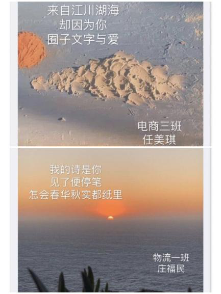 短短三行,是信,是诗,可以在简练的语句中感受到字里行间的情意。本次活动一开始,生活部成员三人一组进班宣传,讲解参赛规则,鼓励大家踊跃参与。最后收到来自本学院同学的43篇投稿。经过评比,来自20级电商4班的江静同学拔得头筹,庄福民、侯申奥等五位同学分别获得二、三等奖。