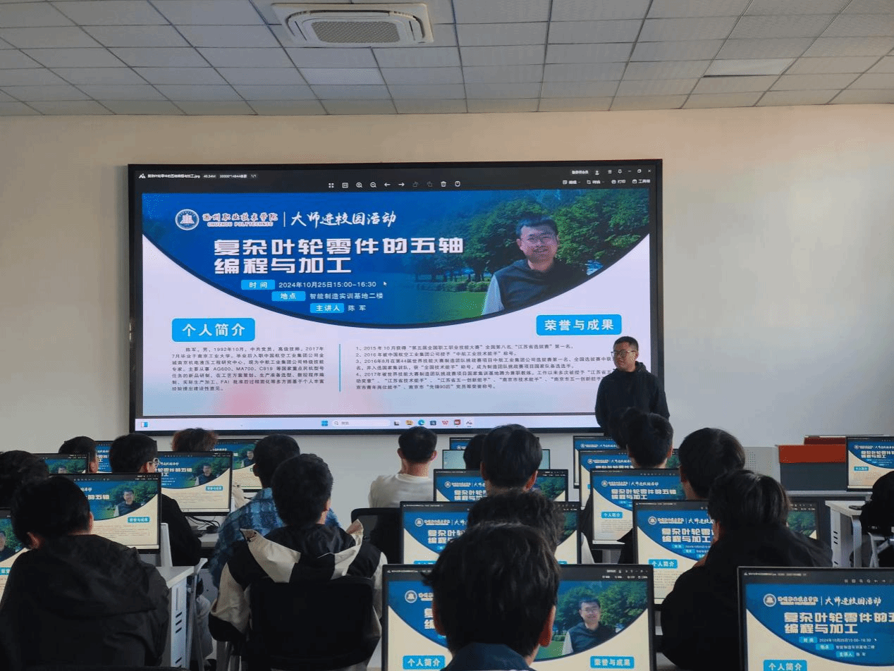 2024年10月25日下午,实验实训中心在智能制造实训基地二楼开展“复杂叶轮零件的五轴编程与加工”专题讲座。本次讲座特别邀请了全国技能能手、江苏省五一劳动奖章获得者、中国航空工业集团特级技能专家陈军来为beat36560余名师生带来五轴叶轮领域的最新前沿技术。