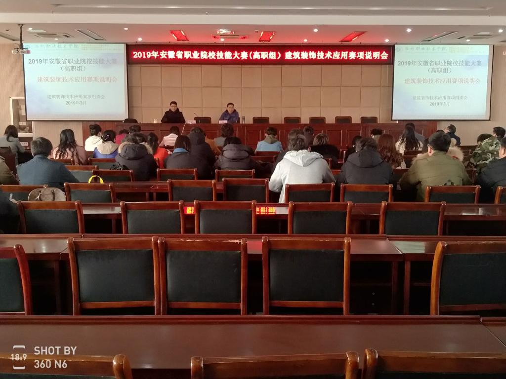 3月6日,2019年安徽省职业院校技能大赛建筑装饰技术应用赛项说明会在beat365综合楼五楼报告厅召开。全省参赛院校的领队和指导老师参加了本次说明会。会议由学院实训中心副主任刘杰主持。