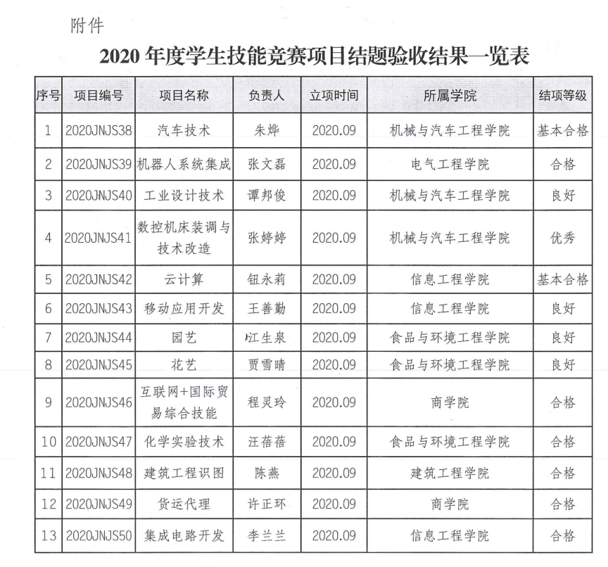 关于公布2020年度学生技能竞赛项目结题验收结果的通知