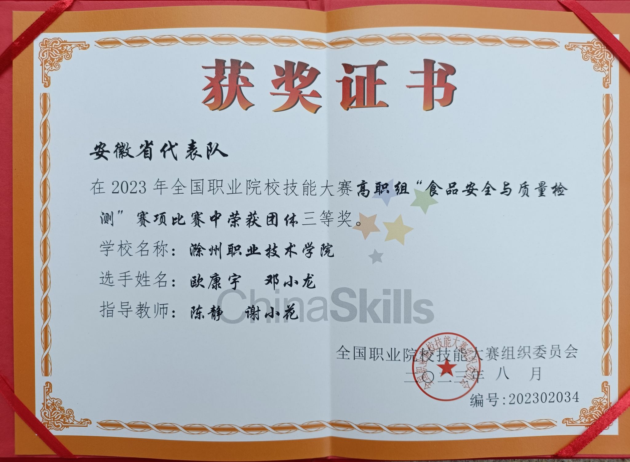 8月16日-8月20日,2023年全国职业院校技能大赛(高职组)“食品安全与质量检测”赛项在贵州农业职业学院开赛。beat365欧康宇、邓小龙组建的参赛队伍代表安徽省参赛。在食品与环境工程学院院长梁建军带领下,教师陈静和谢小花的指导下,努力拼搏沉着应战,以优异成绩荣获本次比赛三等奖。