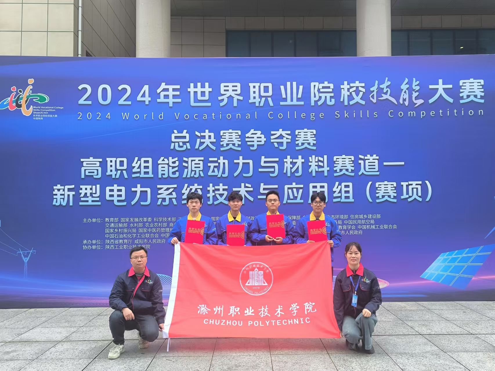 来自电气工程学院的张想、赵开宇、宋浩浩、朱永峰同学在朱山川、陶璐老师指导下,以优异成绩荣获“新型电力技术与应用”赛项铜奖。