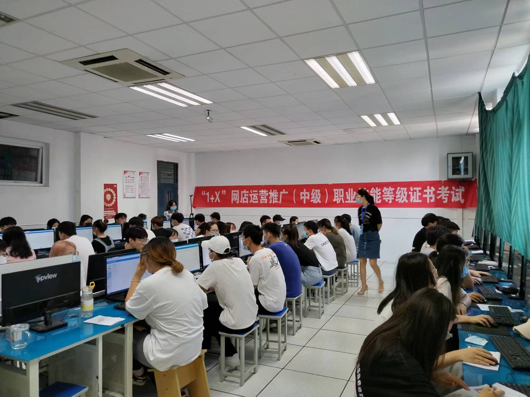互联网学院为了更好的贯彻落实《国家职业教育改革实施方案》中“1+X”证书制度试点工作的要求,加快推进beat365课证融通教学改革实践。一直积极开展“1+X”证书相关的学生培训及考试组织工作,并于2022年6月18日,成功组织2020级电子商务专业学生,共计50名学生参与了《“1+X”网店运营推广(中级)》的考试。副校长苏有良、互联网学院院长姚小园、校实训中心副主任刘杰、商学院电子商务系主任杨剑到现场指导工作。