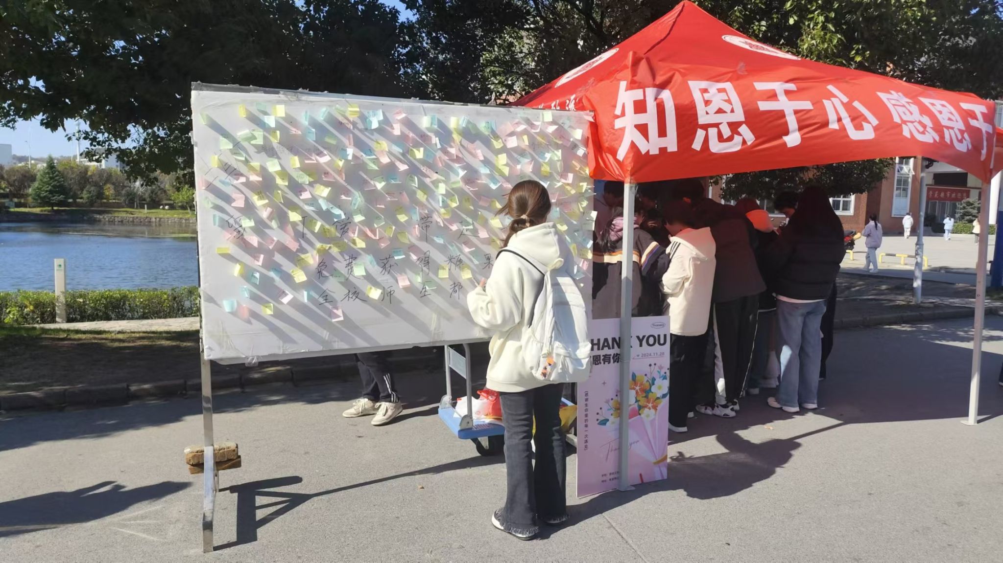 本次活动志愿者提前布置好“感恩留言墙”,我们准备了感恩卡片、便签纸和小礼物等,同学们纷纷写下对老师的感激之情和对亲人的思念之情,一句句真挚的留言,让路过的师生们无不为之动容。