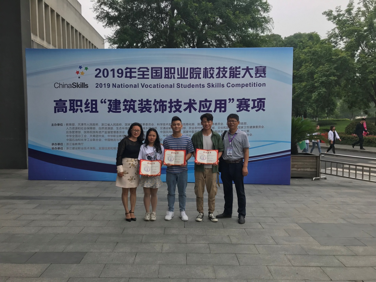 5月31至6月2日,2019年全国职业院校技能大赛高职组“建筑装饰技术应用”赛项在浙江建设职业技术学院举行,共有来自全国28个省市的79支代表队参赛。beat365土木工程系和传媒工程系组建的以王家婷、卢中福、殷子腾为选手,张国富、黄瑞为指导教师的代表队,经过激烈角逐,荣获团体三等奖。