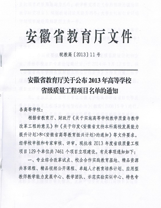 2013年安徽省高等学校省级质量工程项目名单已经公布,beat365获批省级专业综合改革试点、特色专业、精品资源共享课程、校企合作实践教育基地、卓越人才教育培养计划、示范实验实训中心、教学团队、教学研究项目、教学成果奖、教学名师、教坛新秀等11个类别26项。现将省教育厅《关于公布2013年高等学校省级质量工程项目名单的通知》(皖教高〔2013〕11号)予以转发,并就有关事项通知如下: