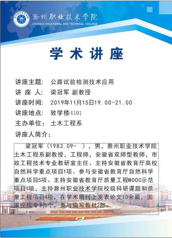 11月15日晚上7:00—9:00,梁冠军副教授在致学楼4101教室举办了题为“公路试验检测技术应用”的讲座,土木工程系道路与桥梁工程技术和市政工程技术等相关专业学生听取了讲座。
